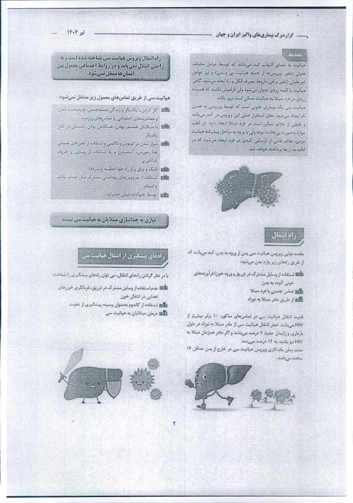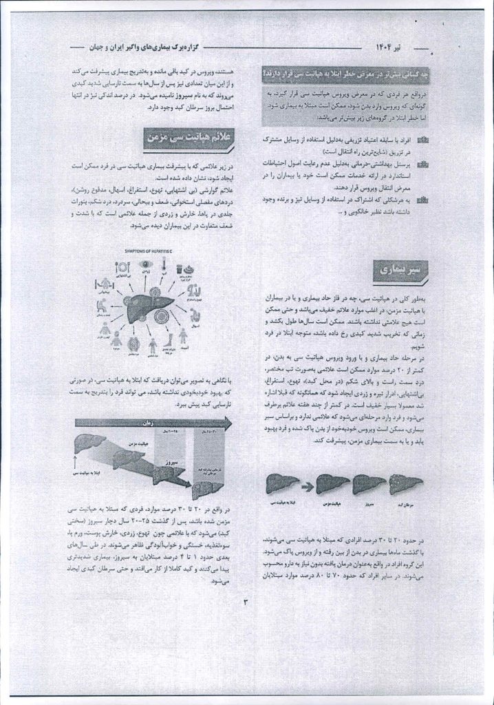 با توجه به این که هپاتیت به عنوان یکی از علل اصلی سرطان کبد بوده و سالانه موجب 1/3 میلیون مرگ و میر شده بی صدا و آرام در حال کسترش است و از سوی دیگر در صورت تشخیص به موقع قابل درمان می باشد . ضروری است به منظور سلامت احاد جامعه و جلوگیری از ابتلا افراد بیشتر ، گزاره برگ بیماری های واگیر ایران و جهان در اختیار کلیه واحدهای ذیربط قرار گیرد.